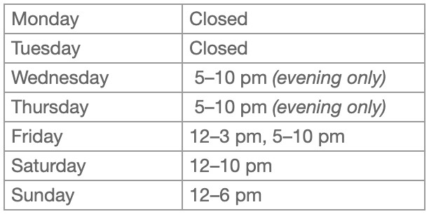 OPENING HOURS. Our Winter opening schedule has been amended. From 1st October, the opening schedule is as aside.