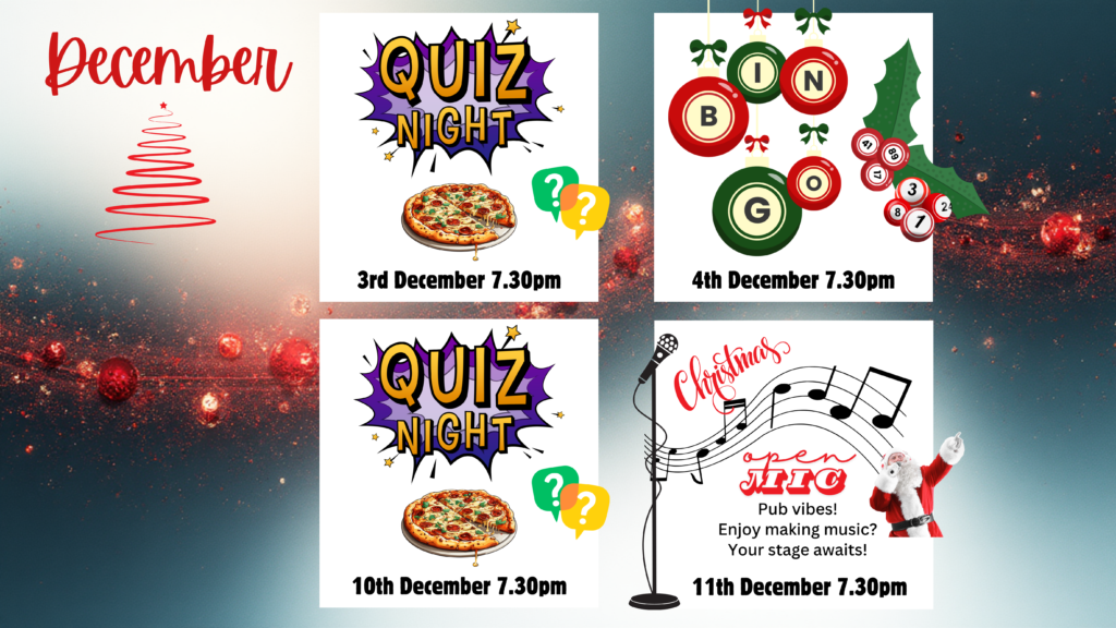 There’s the legendary Wednesday Weekly Quiz Nights with pizzas from pop-up Artisan Pizzeria. Please note we serve only pizzas that night.