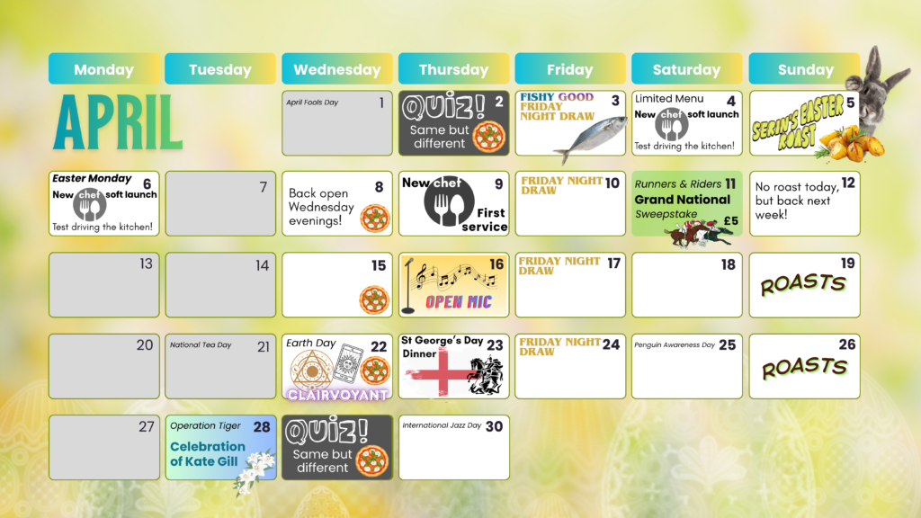 We’re a small pub with a big heart and an ever-evolving schedule, so check back often!