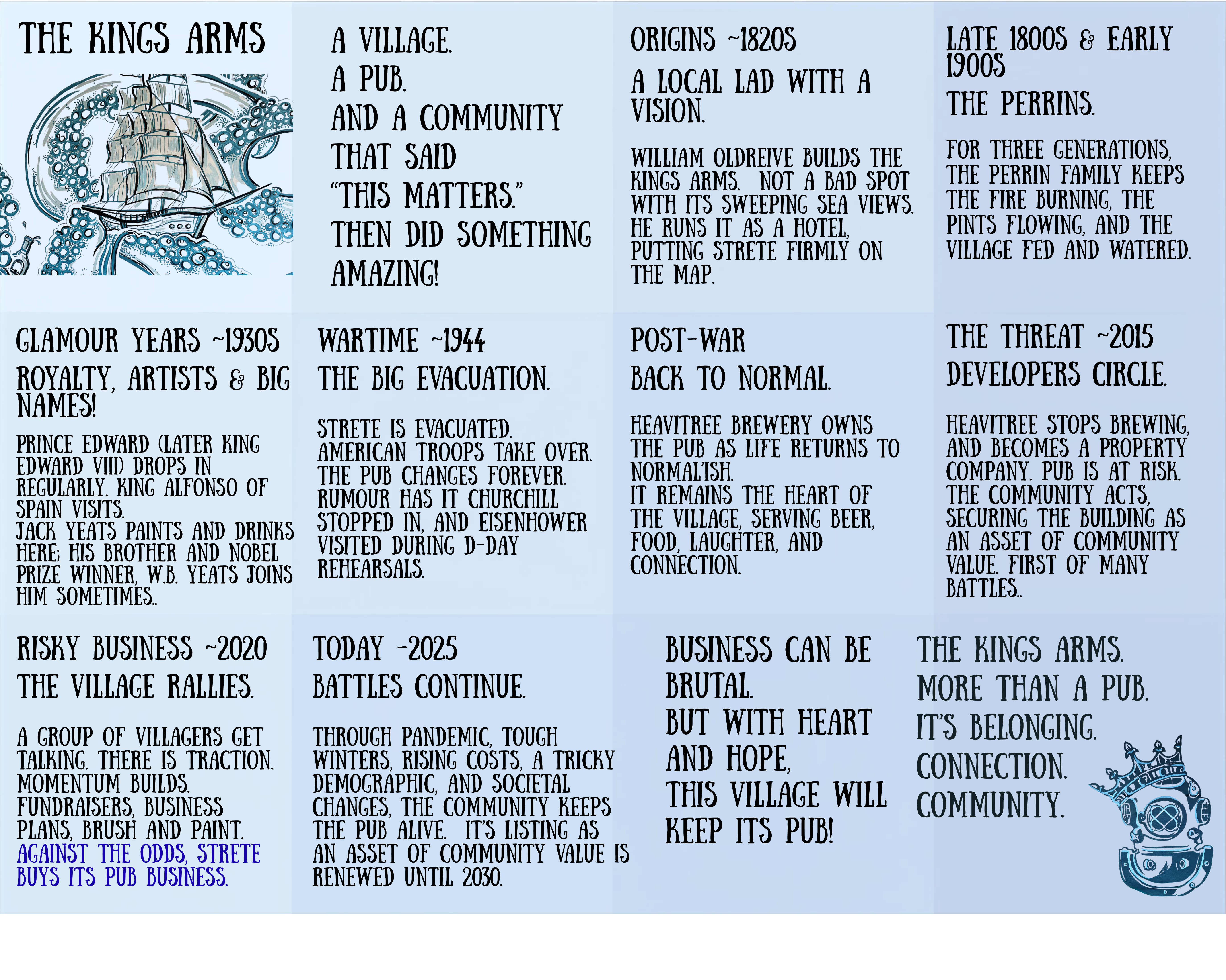 Now we, the village of Strete, as a Community Benefit Scheme, are the owners of Strete Community Pub Limited. The Kings Arms is run by us, the village – for locals, visitors, and anyone who values connection, conversation and a pint with a view.