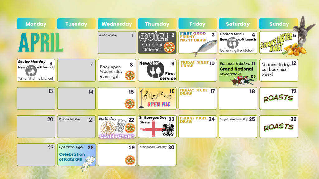 We’re a small pub with a big heart and an ever-evolving schedule, so check back often!